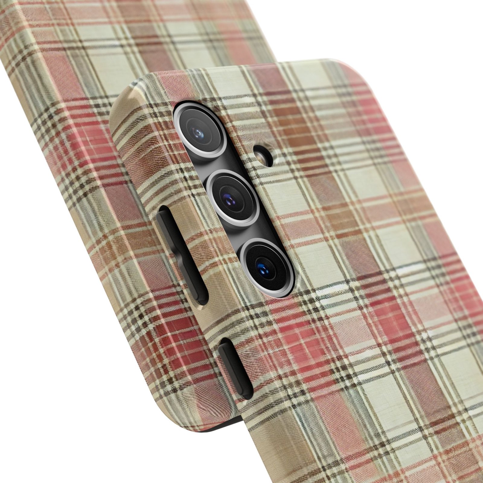 In the Apple Orchard Plaid tough phone case, faded russet, sandy beige, and soft rose come together like an old flannel left out after a summer bonfire. The weave feels sun-baked yet still going strong, full of porch swings, hayrides in the apple orchard, cider scents, and afternoons that slip lazily into golden, dusty evenings.