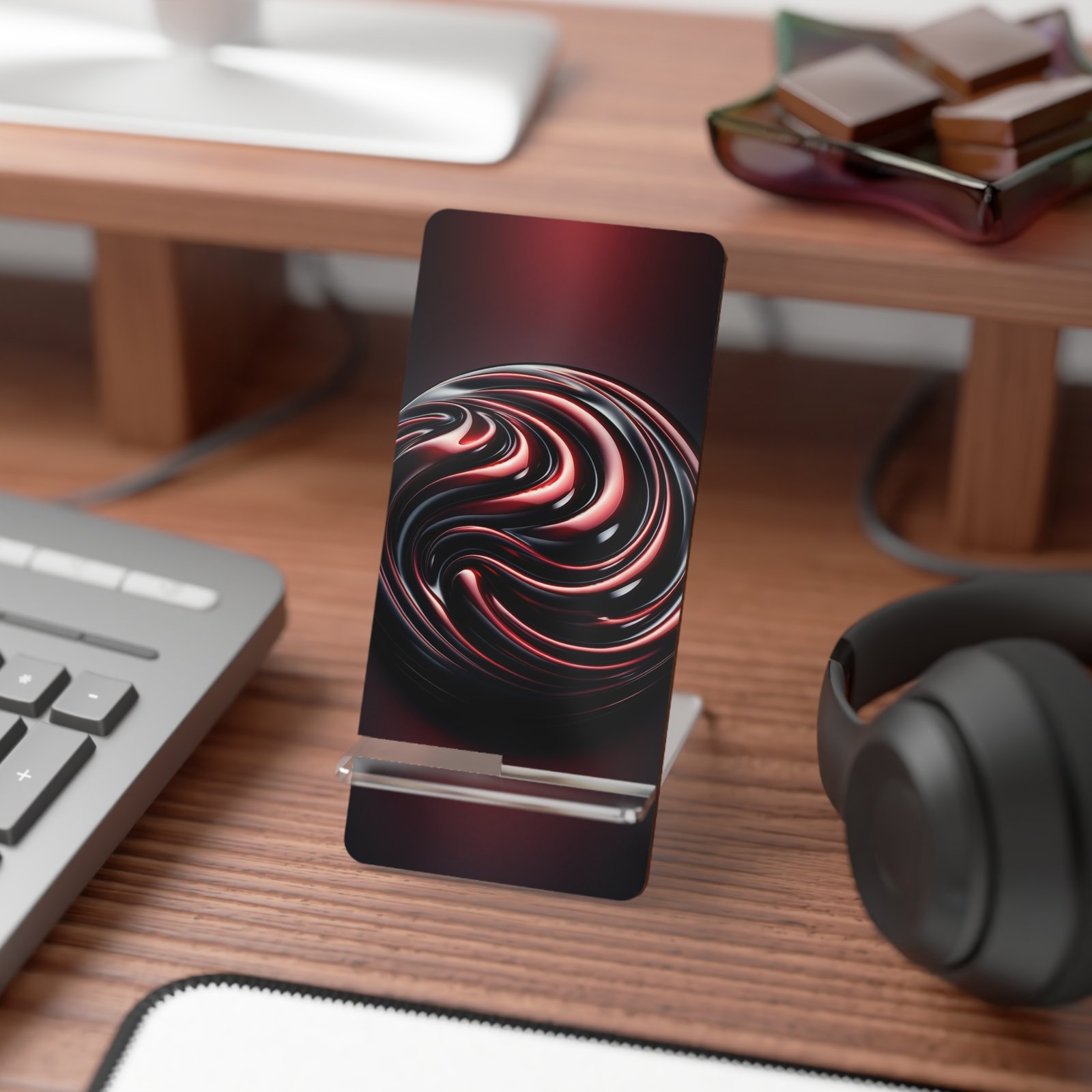 The companion phone stand to the Dark Cherry Cascade phone case. In this one, a polished, swirling disc of black and dark cherry flows like molten lacquer under focused light. Ripples curve inward and out, reflecting glints of red like embers under glass. The background deepens from maroon to black, accentuating the magnetic, fluid intensity of the centerpiece.