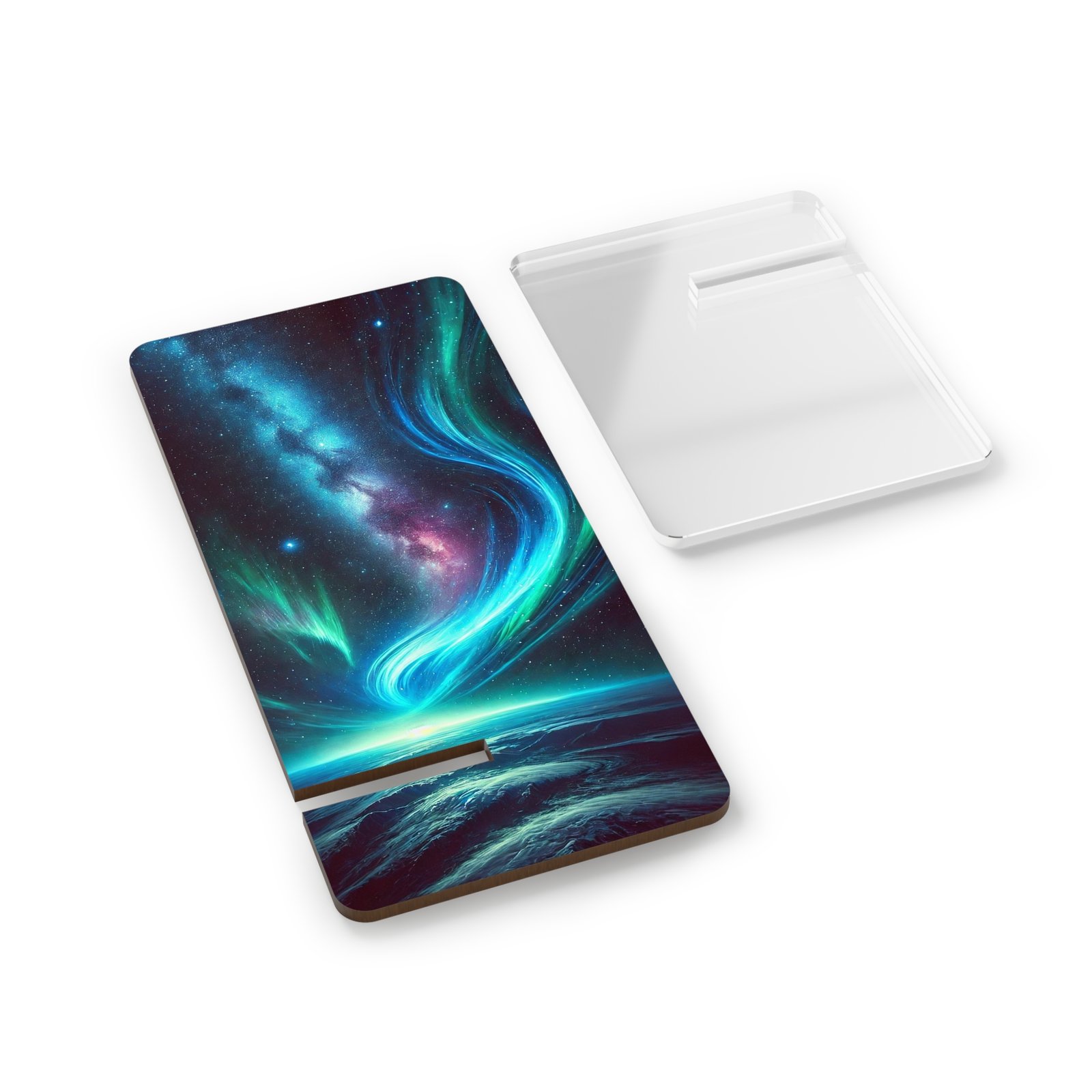The companion phone stand to the Galactic Drift phone case. In this one, vast cosmic sky shimmers with deep blues, greens, and violet hues as luminous waves of aurora swirl toward the heavens. Below, an endless ocean stretches, its surface glowing under a distant celestial light. The universe and earth blend in a mesmerizing cosmic ballet.