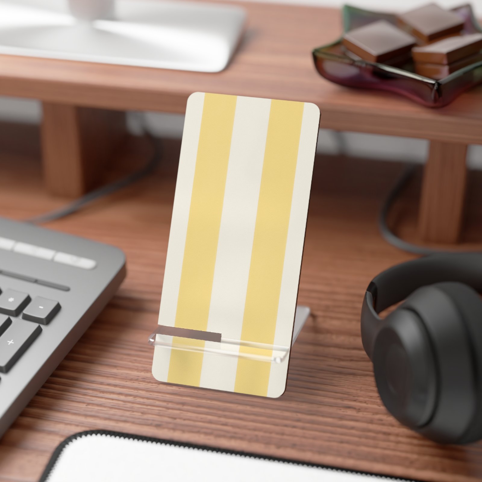The companion phone stand to the Lemon Bar Days phone case. In this one, evenly spaced yellow and off-white stripes run vertically in a soft, sunlit palette. The pattern feels like summer days off, beach umbrellas, or bakery awnings—simple and bright, with the kind of comfort that recalls warm afternoons, sugar-dusted treats, and screen doors left open.