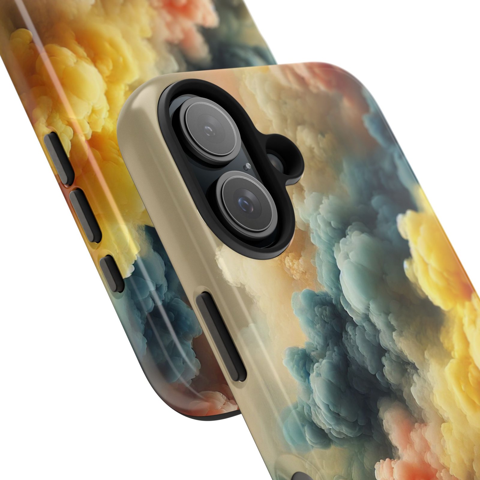 In the When Clouds Wore Color tough phone case, billowing clouds bloom in peach, teal, gold, and cream, drifting like weightless confections. They spiral upward with a hush, each puff tinted like it’s caught a breeze of sunrise. The sky fades behind them in a creamy beige, letting the color take center stage in a hushed crescendo.